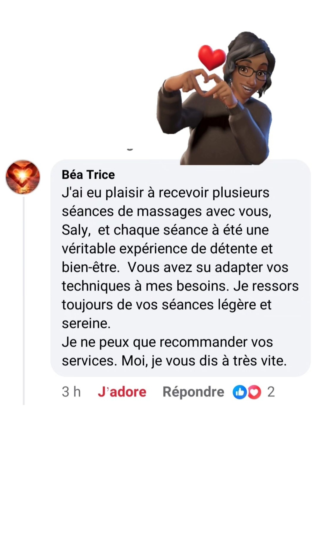 Je suis Saly massothérapeute à domicile et infirmière. Une valeur essentielle pour moi est d’aider les femmes à se sentir mieux dans leurs corps et esprit pour pouvoir affronter les complexités de la vie avec des soins humains et personnalisés.
